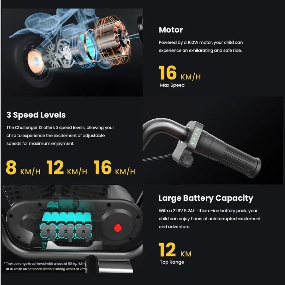 Toujours utiliser sous la surveillance d’un adulte, sur terrain privé/autorisé, avec casque et protections. Ajuster la pression des pneus (45–50 PSI). Choisir le mode de vitesse adapté au niveau de l’enfant.